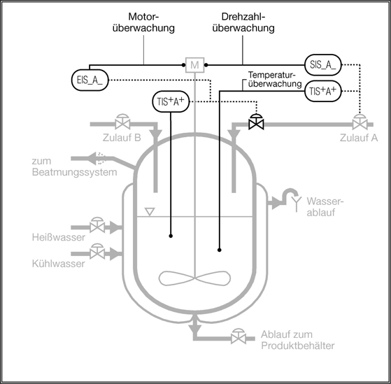 Als Abstoppersystem wird hier ein System bezeichnet, mit dem aus einem Vorlagebehälter eine inhibierende Substanz – unabhängig von den sonst in einem Reaktionsbehälter durchzuführenden Verfahrensschritten – schnell und wirksam in den Reaktionsbehälter eingespeist werden kann. Die Auslösung des Abstoppersystems kann von Hand oder bei Überschreiten von bestimmten Prozessparametern automatisch erfolgen.